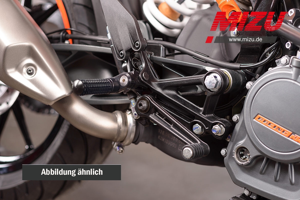 Like our brake and clutchlevers, you can now adjust your footpegs to avoid annoying slipping. The difference comes from the internal adjustment for a perfect, sporty design. Individual adjustment of the MIZU Flex footpegs to your sitting position as well as changing the distance to the controls is possible. The footpegs can be adjusted in eight different positions. So that the driving pleasure is not limited to the racetrack, our footrests are delivered with ABE (Vehicle operation licence) and allow access to racing gear for everyday use.