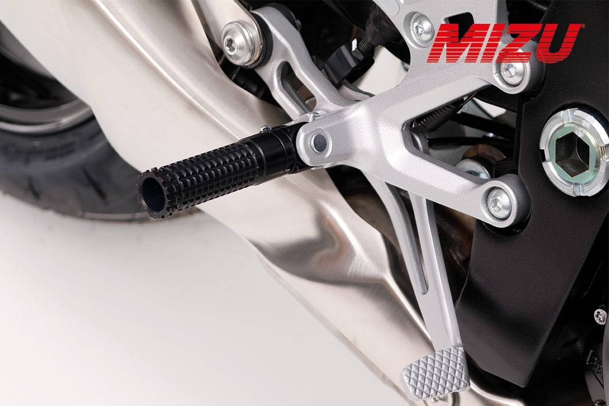 Our MIZU Race footpegs are maximally resilient, provide ideal grip through a milled surface, as well as security in every situation. Say goodbye to your old unwieldy footpegs and swap them with our lightweight sporty race footpegs. So that the driving pleasure is not limited to the racetrack, our footrests are delivered with ABE (Vehicle operation licence) and allow access to racing gear for everyday use.