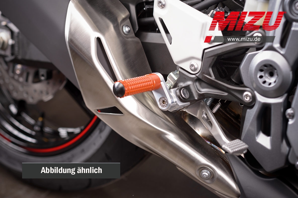 Like our brake and clutchlevers, you can now adjust your footpegs to avoid annoying slipping. The difference comes from the internal adjustment for a perfect, sporty design. Individual adjustment of the MIZU Flex footpegs to your sitting position as well as changing the distance to the controls is possible. The footpegs can be adjusted in eight different positions. So that the driving pleasure is not limited to the racetrack, our footrests are delivered with ABE (Vehicle operation licence) and allow access to racing gear for everyday use.